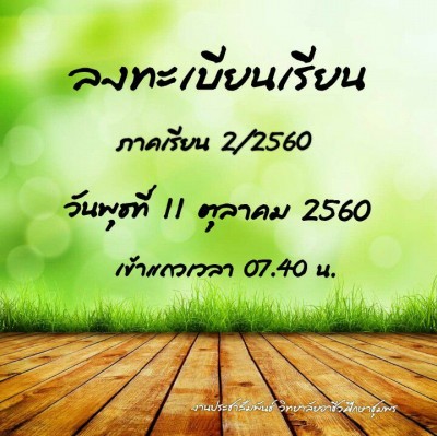 วิทยาลัยอาชีวศึกษาชุมพร ได้กำหนดการลงทะเบียนเรียนของนักเรียน นักศึกษา ประจำภาคเรียนที่ 2 ปีการศึกษา 2560 ในวันพุธที่ 11 ตุลาคม 2560 ณ วิทยาลัยอาชีวศึกษาชุมพร