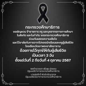 กระทรวงศึกษาธิการ ขอเชิญชวน ข้าราชการ ครู และบุคลากรทางการศึกษา ในสังกัด และในกำกับ ของกระทรวงศึกษาธิการ ร่วมกันแสดงความเสียใจ และไว้อาลัยกับการจากไปของนักเรียนและครูผู้เสียชีวิต โรงเรียนวัดเขาพระยาสังฆาราม ด้วยการไว้ทุกข์ให้กับผู้เสียชีวิต เป็นเวลา 3 วัน ตั้งแต่วันที่ 2 ถึงวันที่ 4 ตุลาคม 2567