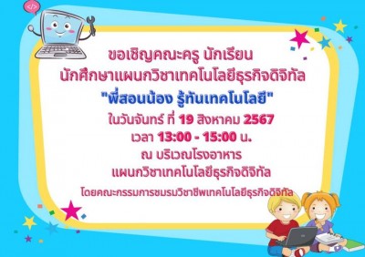 🎉ประชาสัมพันธ์🎉 📍ขอเชิญคณะครูนักเรียน นักศึกษา แผนกวิชาเทคโนโลยีธุรกิจดิจิทัลเข้าร่วมโครงการ 'พี่สอนน้อง รู้ทันเทคโนโลยี'