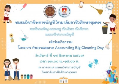 🎉ประชาสัมพันธ์🎉 📍ขอเชิญคณะครู นักเรียน นักศึกษา แผนกวิชาการบัญชี เข้าร่วมโครงการ 'ทำความสะอาด Accounting Big Cleaning Day'