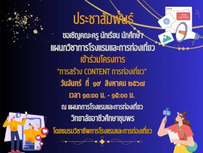 🎉ประชาสัมพันธ์🎉 📍ขอเชิญคณะครูนักเรียน นักศึกษา แผนกวิชาการโรงแรมและการท่องเที่ยว เข้าร่วมโครงการ 'การสร้าง Content การท่องเที่ยว'