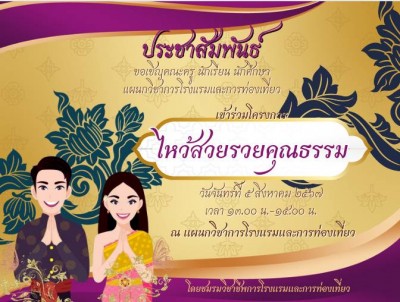 🎉ประชาสัมพันธ์🎉 📍ขอเชิญคณะครู นักเรียน นักศึกษา แผนกวิชาการโรงแรมและการท่องเที่ยว เข้าร่วมโครงการ 'ไหว้สวยรวยคุณธรรม' 📌วันจันทร์ ที่ 5 สิงหาคม พ.ศ.2567 เวลา 13:00 น. -15:00 น. ณ แผนกวิชาการโรงแรมและการท่องเที่ยว โดยชมรมวิชาชีพการโรงแรมและการท่องเที่ยว