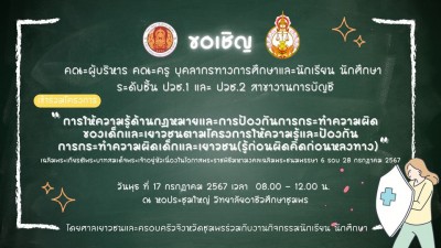 ขอเชิญคณะผู้บริหาร คณะครู บุคลากรทางการศึกษาและนักเรียน ระดับชั้น ปวช.1 และปวช.2 สาขางานการบัญชี เข้าร่วมโครงการการให้ความรู้ ด้านกฎหมายและการป้องกันการกระทำความผิด