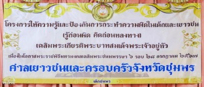 ศาลเยาวชนและครอบครัวจังหวัดชุมพร จัดกิจกรรม 'โครงการการให้ความรู้ ด้านกฎหมายและการป้องกันการกระทำความผิดของเด็กและเยาวชนตามโครงการให้ความรู้และป้องกันการกระทำความผิดเด็กและเยาวชน