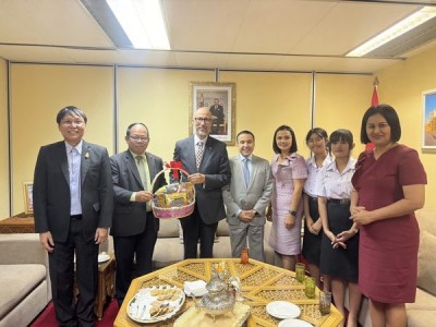 ดร.ณรงค์ แก้วสิงห์ ผู้อำนวยการวิทยาลัยอาชีวศึกษาชุมพร พร้อมด้วย ผู้บริหาร คณะครู และนักเรียน นักศึกษา แผนกแฟชั่นและสิ่งทอ เข้าพบท่านเอกอัครราชทูต อัครทูต และคณะ เพื่อหารือความร่วมมือในการแลกเปลี่ยนนักศึกษาจากประเทศโมร็อคโคกับวิทยาลั