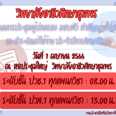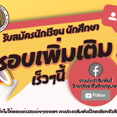 รับสมัครนักเรียน นักศึกษา รอบเพิ่มเติม เร็วๆนี้ ติดตามรายละเอียดทางเพจงานประชาสัมพันธ์วิทยาลัยอาชีวศึกษาชุมพร
