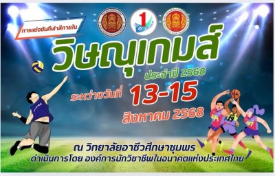 📣 ขอเชิญคณะผู้บริหาร คณะครู บุคลากรทางการศึกษา นักเรียนนักศึกษาวิทยาลัยอาชีวศึกษาชุมพร เข้าร่วมโครงการ 'แข่งขันกีฬาสี ภายใน วิษณุเกมส์ 2568 ' ในระหว่างวันที่ 13-15 สิงหาคม 2568 โดยมีวัตถุประสงค์ เพื่อให้นักเรียน นักศึกษาแสดงออกถึงความสามารถทางด้านกีฬา เพื่อเสริมสร้างสุขภาพพลานามัย ให้ร่างกายแข็งแรง