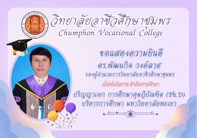 🎊วิทยาลัยอาชีวศึกษาชุมพร ขอแสดงความยินดี 🎊 ดร.พัฒนกิจ วงค์ลาศ รองผู้อำนวยการวิทยาลัยอาชีวศึกษาชุมพร ฝ่ายวิชาการ เนื่องในโอกาส สำเร็จการศึกษา ปริญญาเอก การศึกษาดุษฎีบัณฑิต (Ph.D) บริหารการศึกษา มหาวิทยาลัยพะเยา