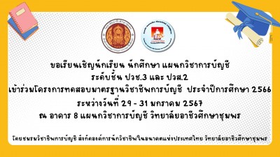 ขอเชิญนักเรียน นักศึกษา แผนกวิชาการบัญชี ระดับชั้น ปวช.3 และ ปวส.2 เข้าร่วมโครงการทดสอบมาตรฐานวิชาชีพการบัญชี ประจำปีการศึกษา 2566