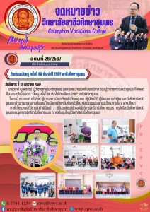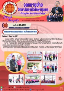 วันจันทร์ ที่ 15 มกราคม 2567 ดร.ณรงค์ แก้วสิงห์ ผู้อำนวยการวิทยาลัยอาชีวศึกษาชุมพร มอบหมายให้ นายพัฒนกิจ วงค์ลาศ รองผู้อำนวยการวิทยาลัยอาชีวศึกษาชุมพร ฝ่ายวิชาการ พร้อมคณะผู้บริหาร คณะครู และบุคลากรทางการศึกษาที่เกี่ยวข้อง