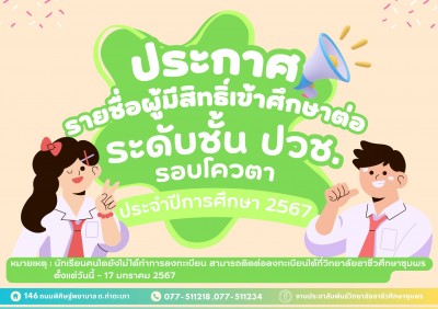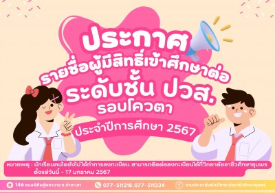 ประกาศรายชือนักเรียนโควตา ระดับ ปวช. ประจำปีการศึกษา 2567