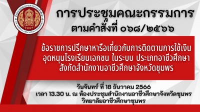 ผู้อำนวยการวิทยาลัยอาชีวศึกษาชุมพร ปฏิบัติหน้าที่ ผู้อำนวยการสำนักงานอาชีวศึกษาจังหวัดชุมพร เป็นประธานในการประชุมข้อราชการปรึกษาหารือเกี่ยวกับการติดตามการใช้เงินอุดหนุนในโรงเรียนเอกชน ในระบบ