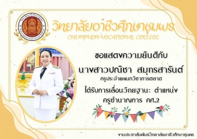 วิทยาลัยอาชีวศึกษาชุมพร ขอแสดงความยินดีกับนางสาวปณิชา สมุทรสารันต์ ครูประจำแผนกวิชาการตลาด ได้รับการเลื่อน วิทยฐานะ ตำแหน่ง ครูชำนาญการ ตำแหน่ง ครูคศ.2