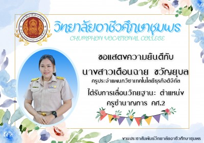 วิทยาลัยอาชีวศึกษาชุมพร ขอแสดงความยินดีกับนางสาวเดือนฉาย ขวัญยุบล ครูประจำแผนกวิชาเทคโนโลยีธุรกิจดิจิทัล ได้รับการเลื่อน วิทยฐานะ ตำแหน่ง ครูชำนาญการ ตำแหน่ง ครูคศ.2