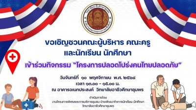 📢งานโครงการพิเศษและการบริการชุมชน ขอเชิญคณะผู้บริหาร คณะครู บุคลากรทางการศึกษา และนักเรียน นักศึกษา วิทยาลัยอาชีวศึกษาชุมพร เข้าร่วมโครงการ ปลอดโปร่งคนไทยปลอดภัย วันจันทร์ที่ 10 พฤศจิกายน พ.ศ. 2568 ณ อาคารอเนกประสงค์ วิทยาลัยอาชีวศึกษาชุมพร เวลา 13:00 - 15:00 น.