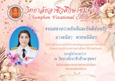 ต้อนรับและแสดงความยินดีกับ ท่านรองผู้อำนวยการ นางจิราภร อเนกศุภพล และ นายธีระยุทธ เหมือนวงษ์ พร้อมคณะ ในโอกาสย้ายและแต่งตั้งให้ดำรงตำแหน่ง รองผู้อำนวยการวิทยาลัยอาชีวศึกษาชุมพร