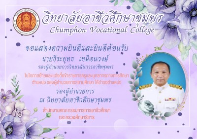 วิทยาลัยอาชีวศึกษาชุมพร ขอแสดงความยินดี และ #ยินดีต้อนรับ 🎊 นายธีระยุทธ เหมือนวงษ์ รองผู้อำนวยการวิทยาลัยการอาชีพชุมพร ในโอกาสย้ายและแต่งตั้งให้ดำรงตำแหน่ง รองผู้อำนวยการวิทยาลัยอาชีวศึกษาชุมพร