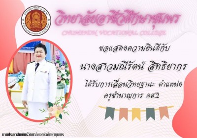 นางสาวมณีรัตน์ สิทธิยากร ครูประจำแผนกวิชาสามัญสัมพันธ์ ได้รับการเลื่อน วิทยฐานะ ตำแหน่ง ครูชำนาญการ ตำแหน่ง ครูคศ.2