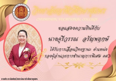 นางจุรีวรรณ อรัญพฤกษ์ รองผู้อำนวยการวิทยาลัยอาชีวศึกษาชุมพร ได้รับการเลื่อน วิทยฐานะ ตำแหน่ง รองผู้อำนวยการชำนาญการพิเศษ คศ.3
