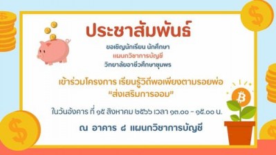 📢 ขอเชิญคณะครู นักเรียน นักศึกษาแผนกวิชาการบัญชีและผู้ที่สนใจเข้าร่วมโครงการ เรียนรู้วิถีพอเพียงตามรอยพ่อ ส่งเสริมการออม